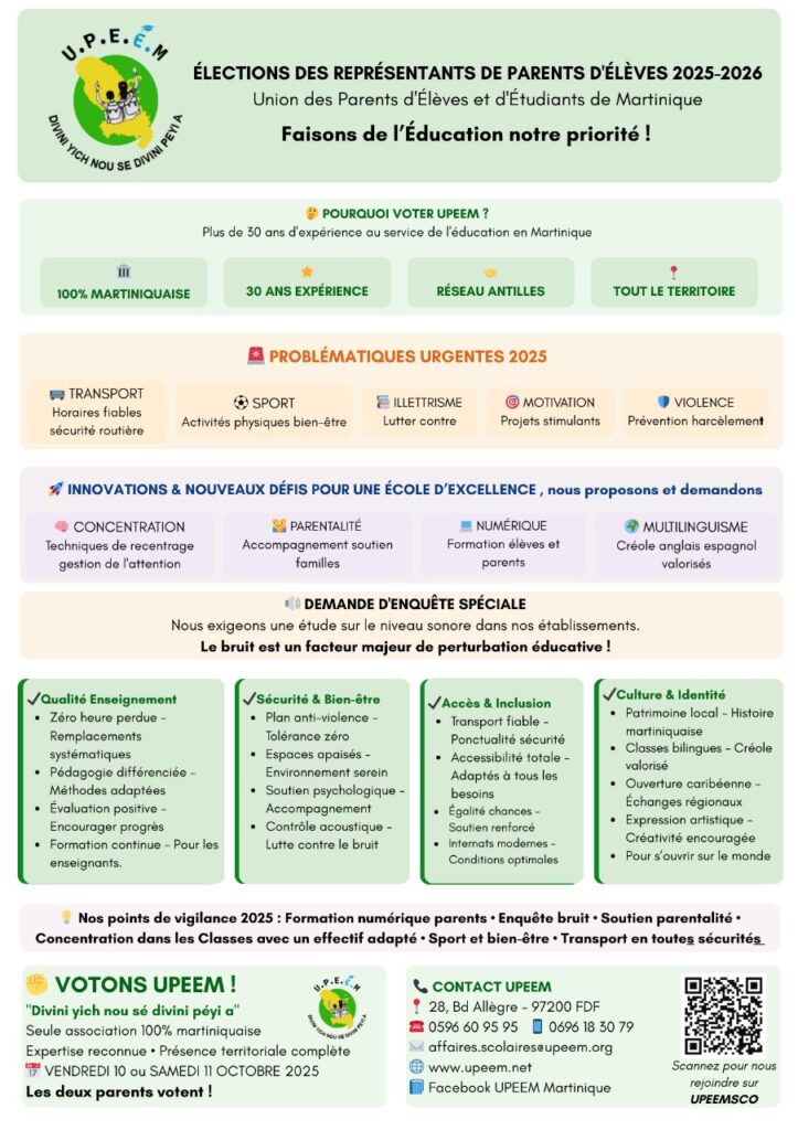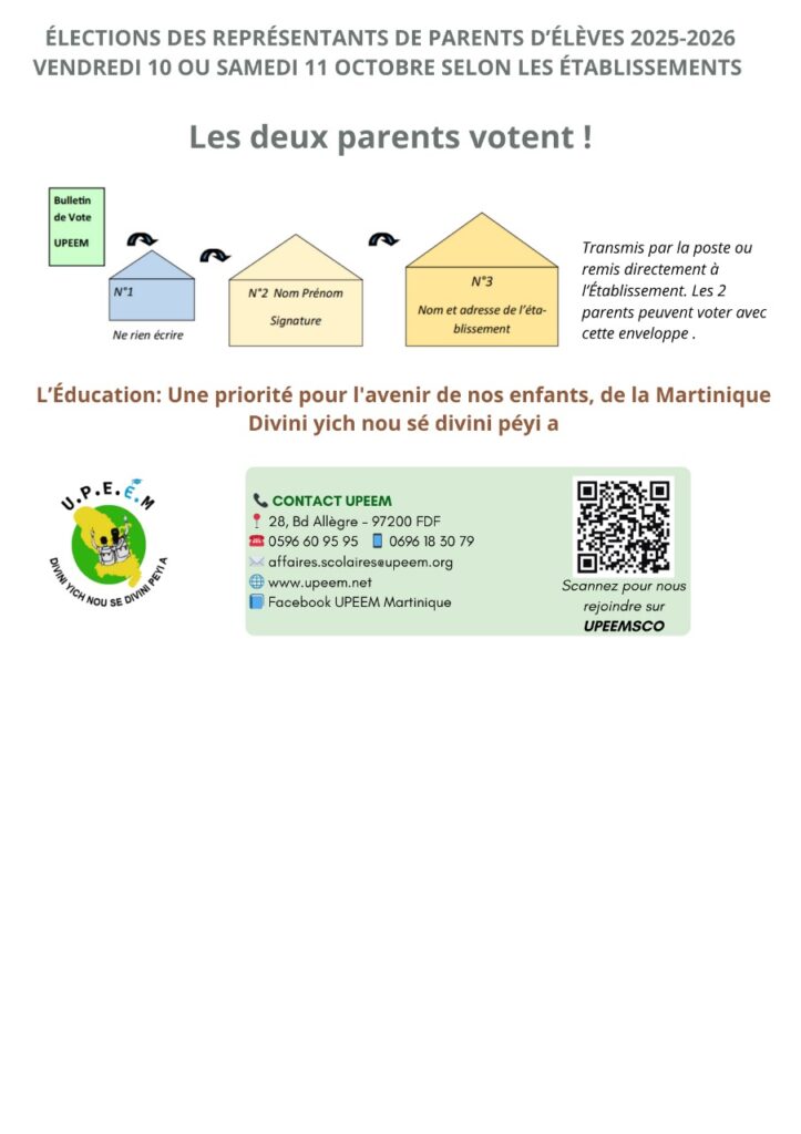 Nous vous informons qu’un webinaire national intitulé « Bien choisir ses spécialités au lycée », organisé par la FCPE en partenariat avec L’Étudiant, se tiendra le jeudi 11 décembre 2025, de 14h à 15h (heure de martinique). Cet événement s’adresse aux parents d’élèves et aux lycéens désireux de mieux comprendre les enjeux des choix de spécialités en première et en terminale générales.